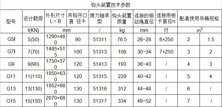 鉤頭及連接裝置,簡稱為鉤頭裝置。 該產品結構簡單,使用性能單一。零件全部由鍛件加工而成,鋼絲繩連接采用了兩種型式,其中5t、7t采用不偏心護繩環,板卡連接;9