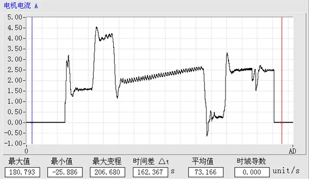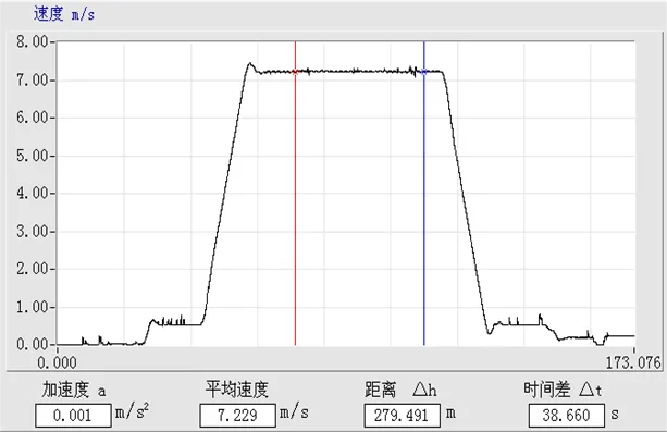 提升機的運行由電控系統控制,使用智能測試儀采集提升機配重上提時的速度曲線和電動機電流曲線,如圖 3、4 所示。為了分析提升機zui大速度運行時提升速度和電動機電流的細節變化,通過處理得到局部放大圖,如圖 5、6 所示。