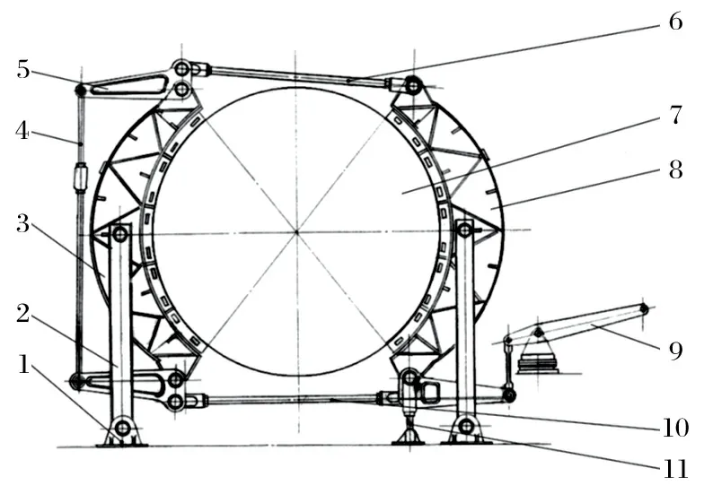 基座 2.主支撐立柱 3.后制動梁 4.垂直拉桿 5.三角杠桿 6.頂拉桿 7.制動滾筒 8.前制動梁      9.把手 10.底拉桿 11.輔助支撐立柱
