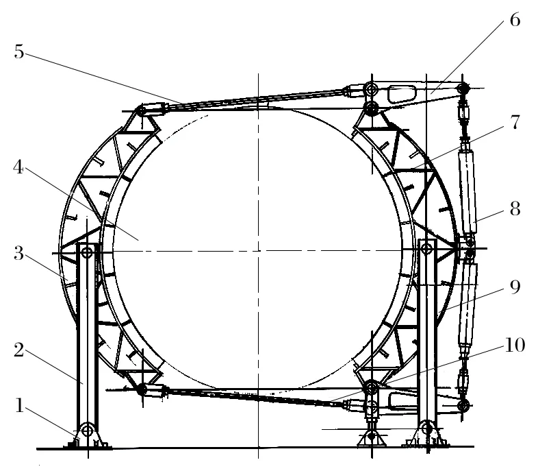 1.基座 2.主支撐立柱 3.后制動梁 4.制動滾筒 5.頂拉桿 6.三角杠桿 7.閘頭 8.垂直拉桿           9.前制動梁 10.底拉桿