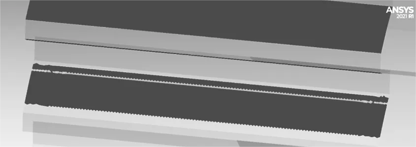 在 SolidWorks 中對同步齒輪進行建模并調(diào)整,確保同步齒輪不會出現(xiàn)干涉。為了提高仿真精度和數(shù)據(jù)的可靠性,對靜強度仿真過程中參與嚙合的幾對輪齒表面網(wǎng)格化。齒面網(wǎng)格細化模型如圖5所示。