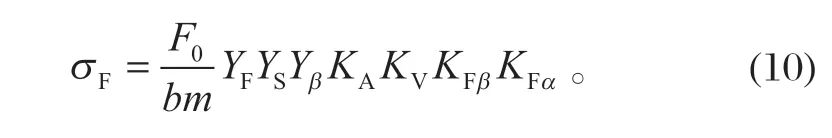 式中:YF 為齒廓系數(shù),YF=1;YS 為應力修正系數(shù),YS=1;KA 為使用系數(shù),KA=1.25;KV 為動載系數(shù),KV=1;KFβ 為螺旋分布系數(shù),KFβ=1;KFα 為載荷分布系數(shù),KFα=1。將各數(shù)據(jù)代入式(10),可得齒根彎曲應力為100.42MPa。